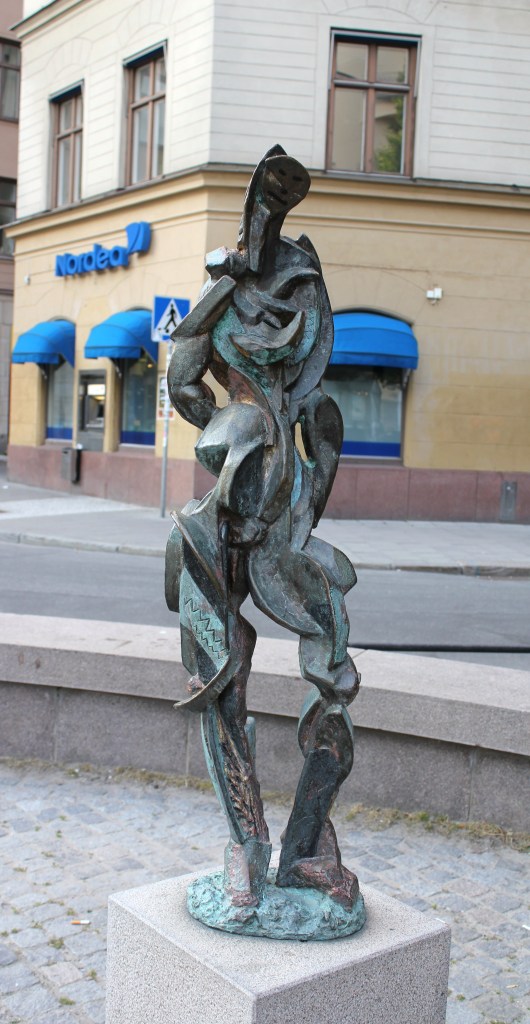 As I set there, lost in my thoughts, a middle-aged women entered the small square pulling a purple shopping cart bag with a small white dog, maybe a crossed French poodle. She walked up the small statue and she started mumbling some words that I couldn’t really comprehend; my Swedish was nonexistent at that point in time. She didn’t look particularly odd, her clothes were quite clean, color matched, and her hair was carefully groomed. She continued mumbling next to the small statue, which was a small cubist man-silhouette; like if she was worshipping an unknown urban deity. There were other people on the small square, but none seem to notice the small ritual of the woman; everybody kept into their own business.
